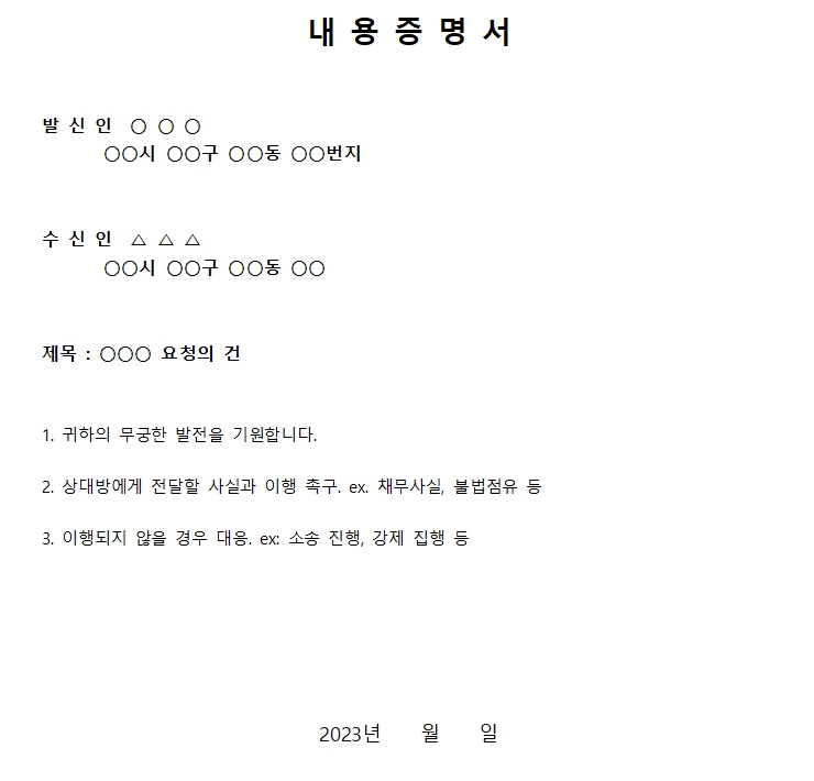 삼. 개인적으로 내용 증명을 보내는 경우가 있습니다. 법률 회사 또는 변호사를 대신하여보낼 수 있습니다. 이 경우 추가 비용이 들지만 개인 명의보다 받는 사람이 심리적 압박감을 더 많이 느낄 수 있는 효과도 있다..