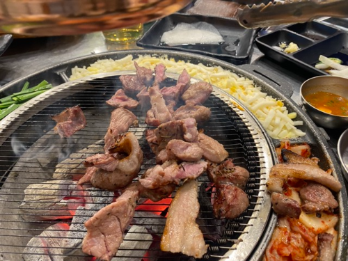 중앙 숯불에 옥수수 모짜렐라 치즈와 쪽파, 김치가 올려지고, 사이드로 독특한 명란젓, 삶은 견과류, 돼지껍데기가 나온다. 돼지껍데기에서 냄새가 살짝 나는게 아쉬웠지만 명란젓을 고기에 올려 먹어보니 지금까지 맛보지 못한 조합의 새로운 맛이었습니다. 아주 좋습니다. 콘 모짜렐라 치즈가 너무 맛있어서 식지 않고 뜨끈하게 먹을 수 있어서 추가해서 또 먹었습니다. 소스는 인절미 가루, 오일 소스, 데리야끼 소스, 와사비 등 다양하게 준비되어 있으며, 부족한 반찬은 셀프 서비스 코너에서 활용하실 수 있습니다.