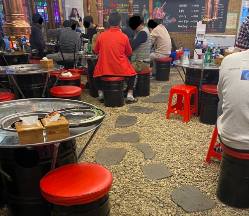 인테리어의 레트로 감성에 벌써부터 너무 넋이 나갔다. 빨강과 초록의 보색조합 간판을 지나 안으로 들어가면 분명 실내인데 바닥이 자갈과 원탁으로 되어있어 야외식당 같은 느낌을 준다.