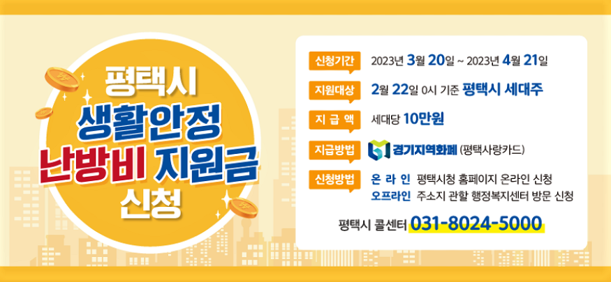 평택시 생활지원금 신청방법 안내입니다. 경기도 평택시가 재난 극복을 위해 모든 가구에 10만원을 지원한다. 일명 ‘난방보조금’으로 가스, 전기, 공과금, 대중교통, 물가상승 등으로 생활에 어려움을 겪고 있는 평택시민들에게 긴급구호를 해준다고 합니다. 최근에 정부에서 복지에 과징금을 부과했다는 이야기가 있는데 지금은 생활 안정이 우선인 것 같아요.